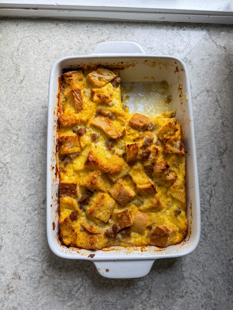 This sourdough breakfast casserole with eggs, sausage, and cheddar is so easy to throw together and perfect for feeding a crowd! It is a long time family recipe from growing up and is one I now make for my daughter. You throw everything into a casserole pan the night before, refrigerate overnight, and bake in the morning – making it perfect for busy mornings or special occasions. Plus it is packed with protein and healthy fats for a wholesome start to the day.
